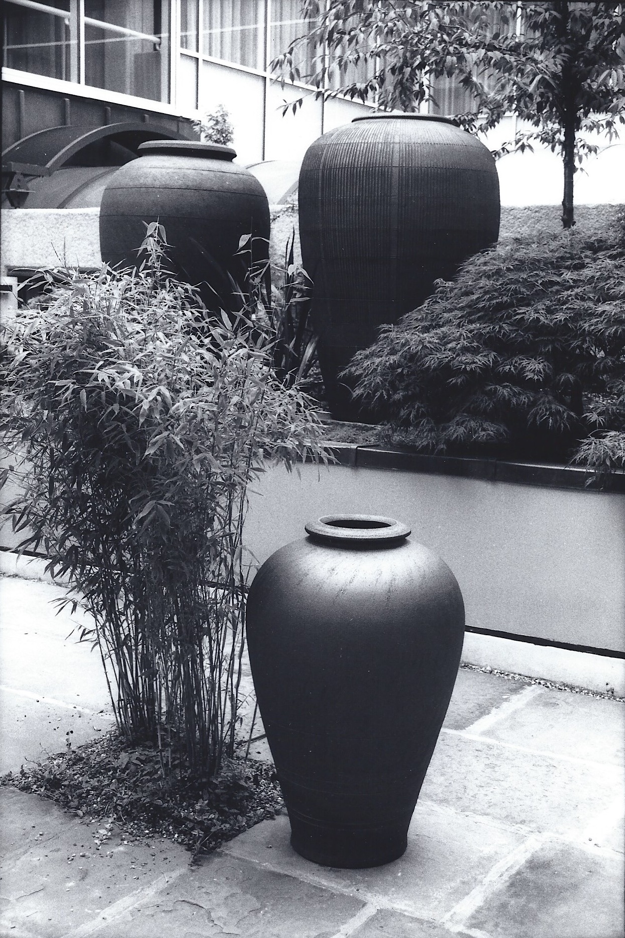 In a garden landscape or in an architectural setting they are supremely sculptural forms, as the vast pots in the Queen Elizabeth Conference Centre show. Here the strong curve of the ample shoulder rising above acer leaves suggests the smooth round form of some Buddha-like figure fixed forever in the act of contemplation. Here too the pots’ rich textures recall the contrasted but always tranquil elements of a Japanese garden, and makes them peculiarly sympathetic to the textural qualities of plants.